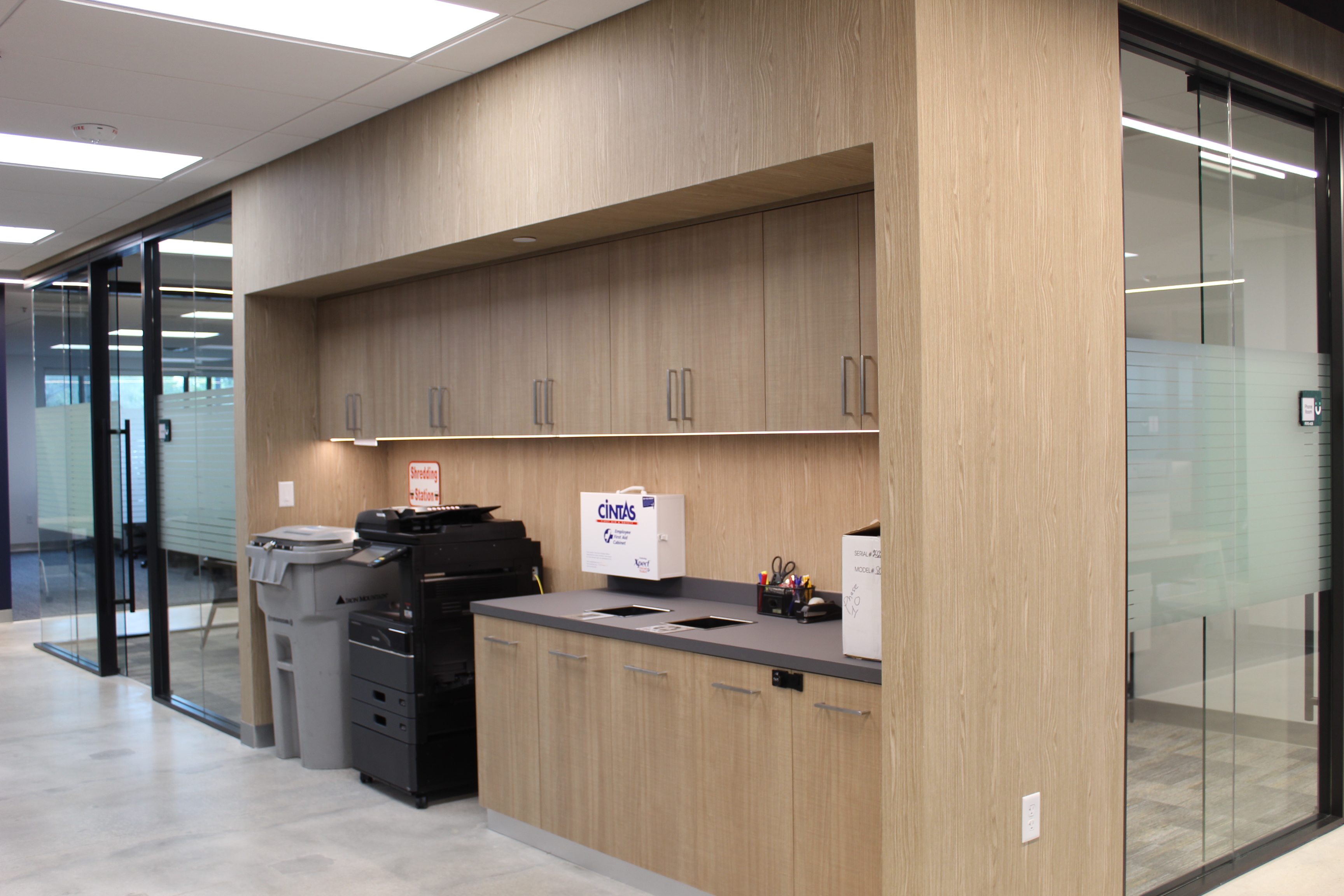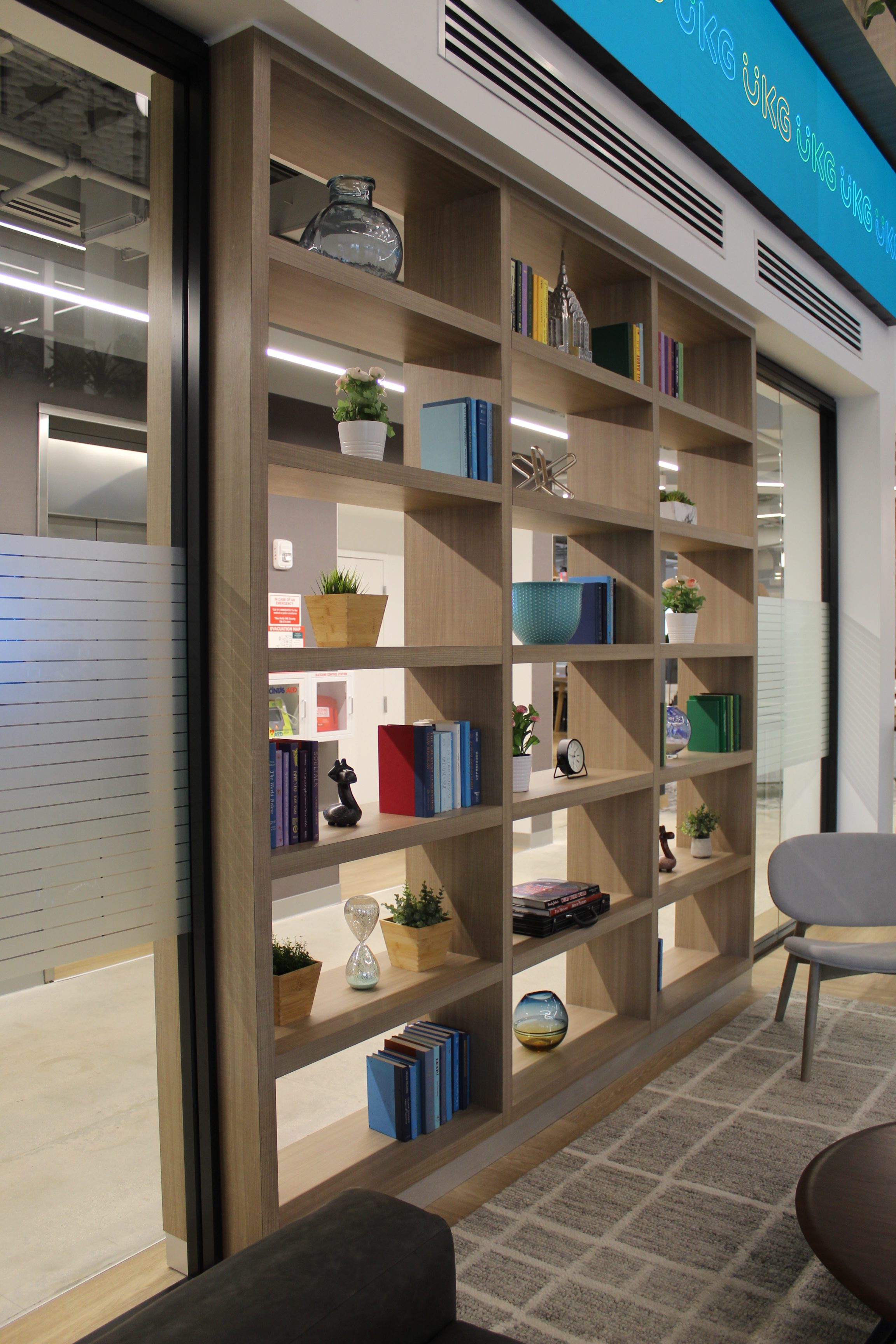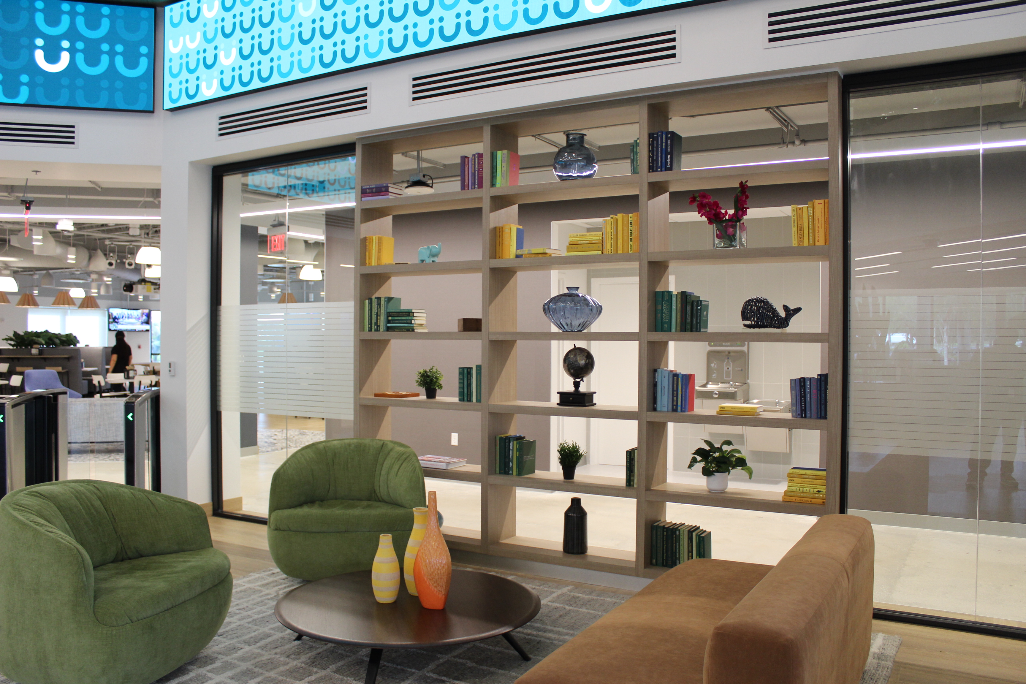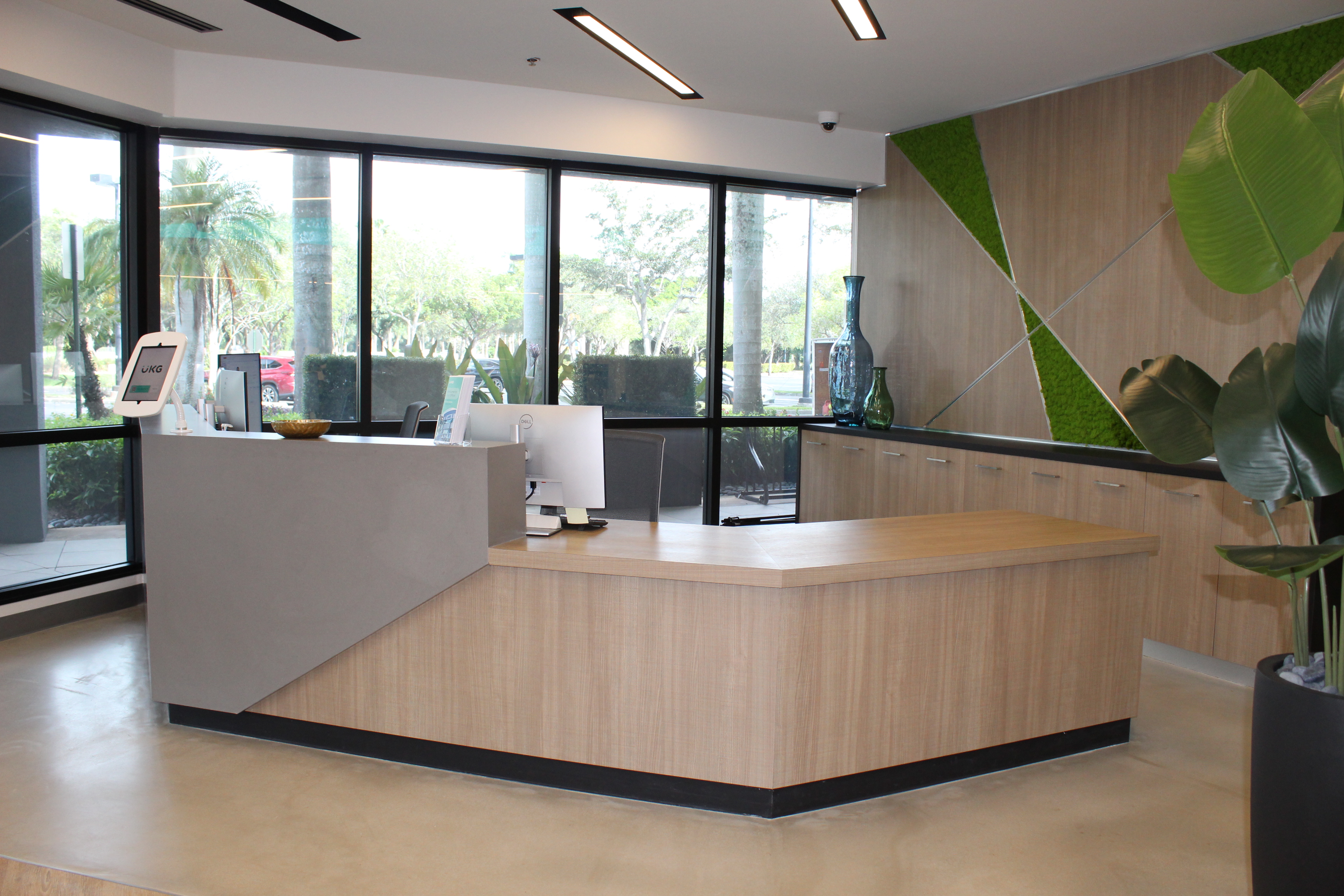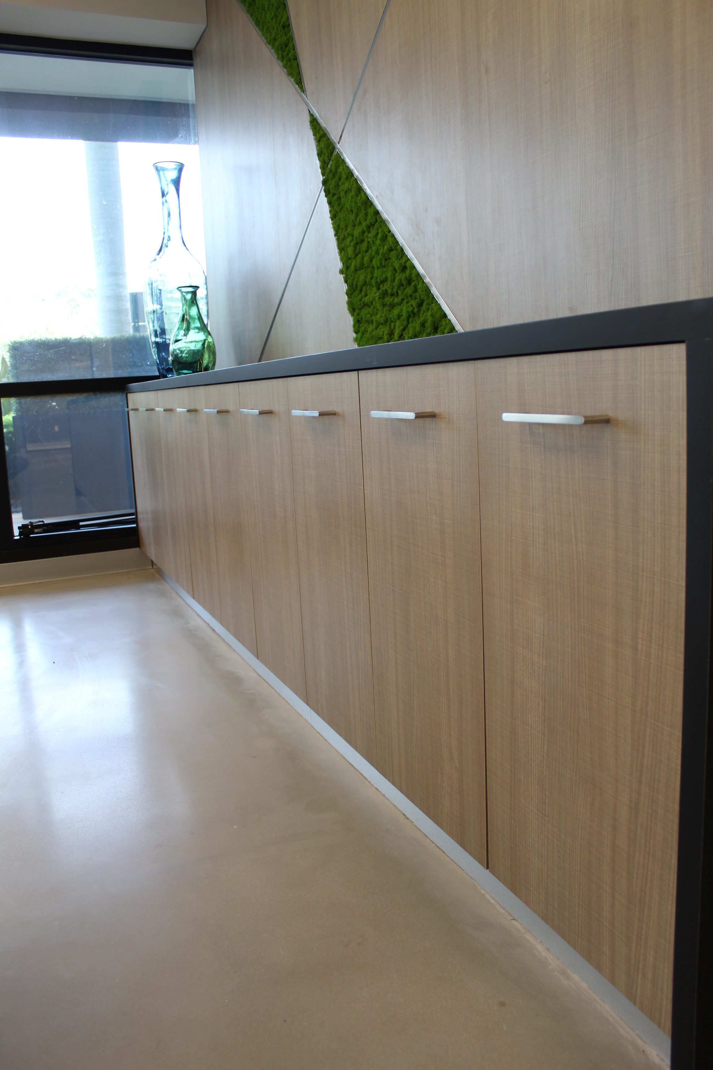 Green accents and custom woodwork bring corporate