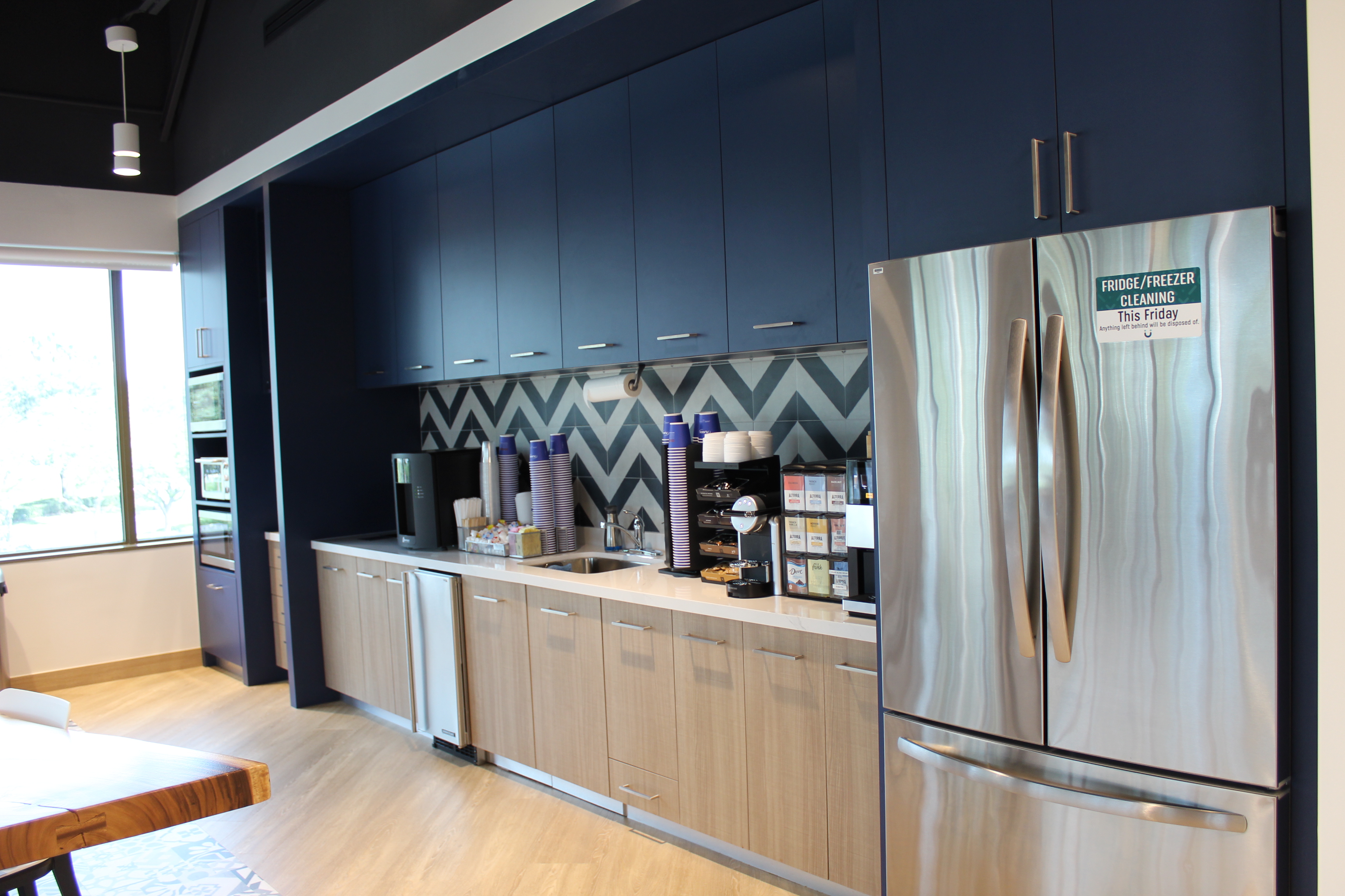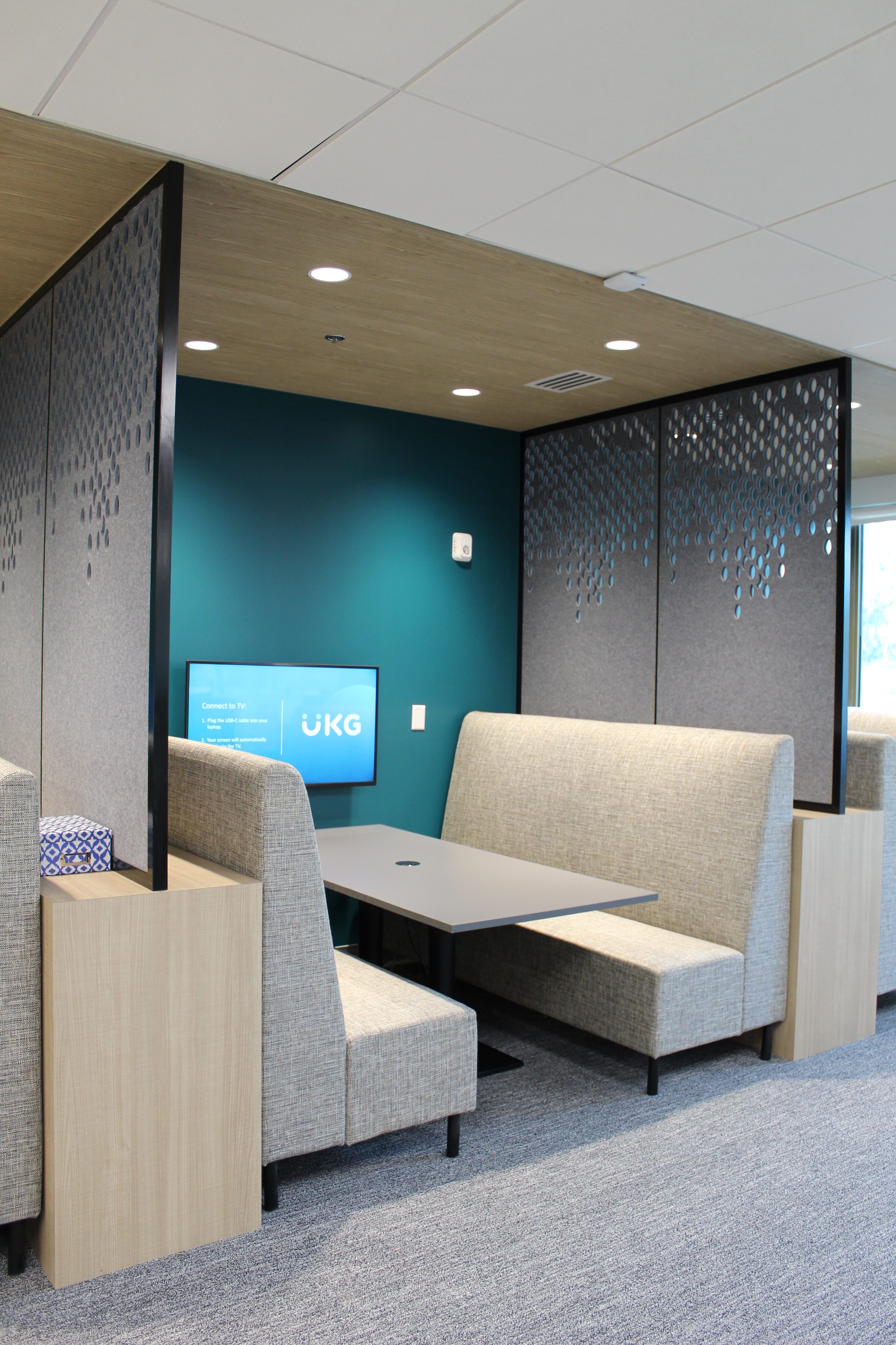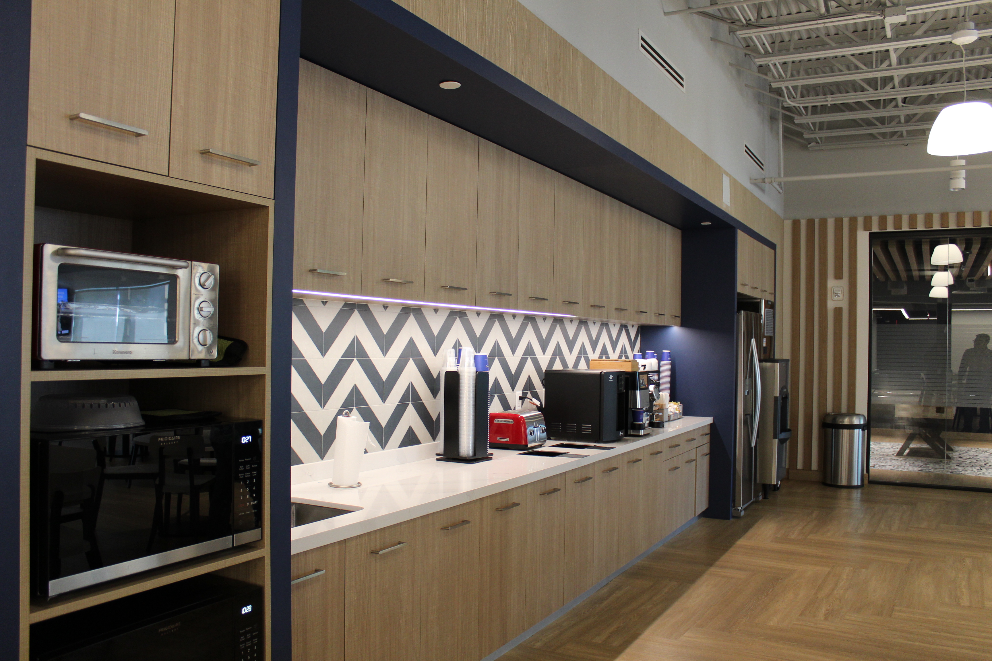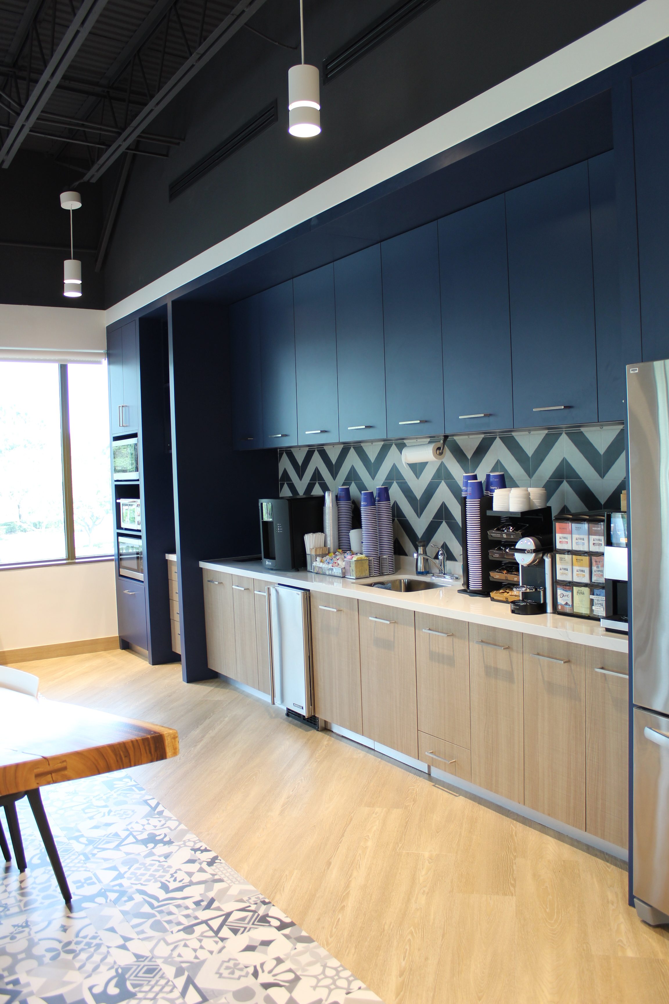 Green accents and custom woodwork bring corporate