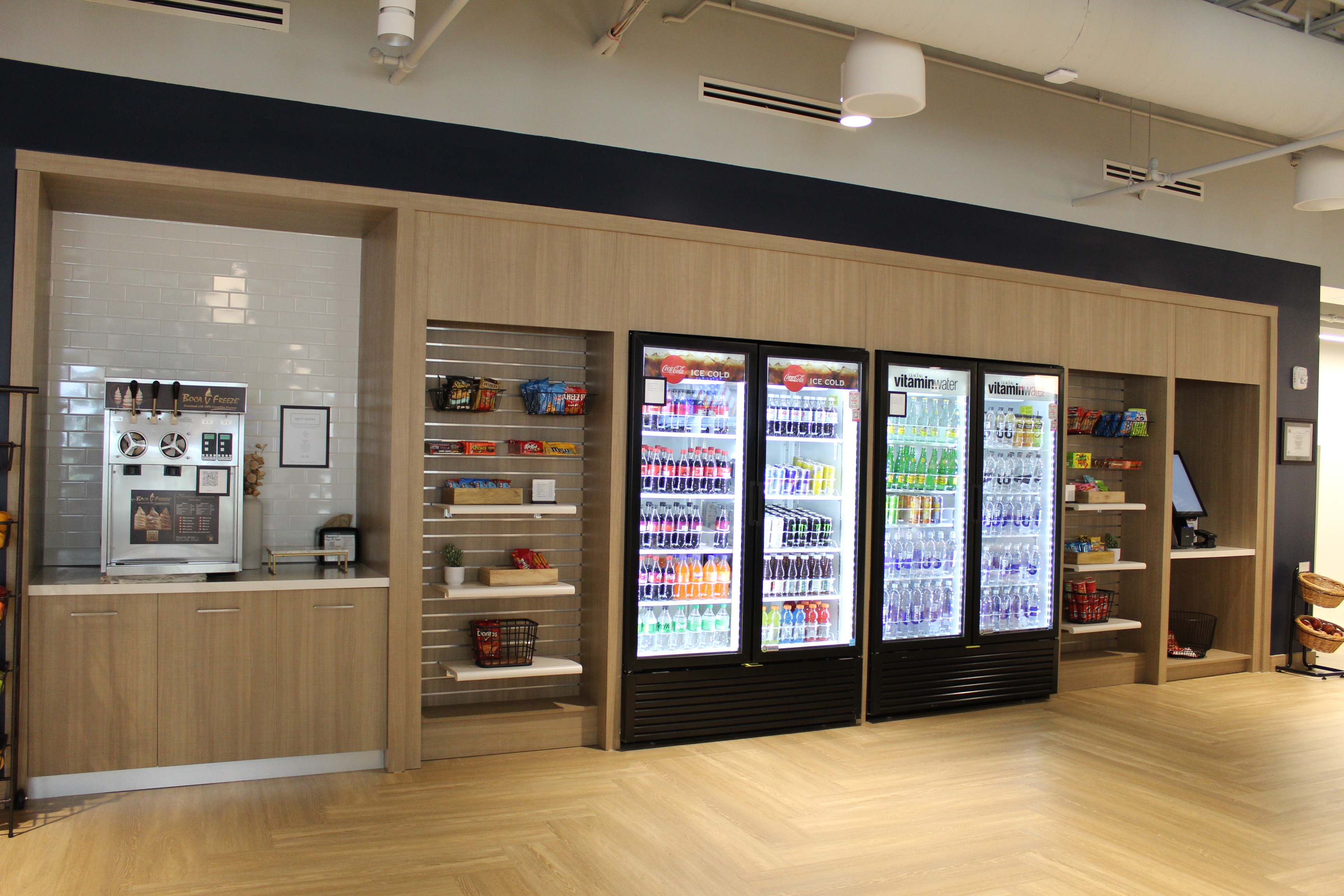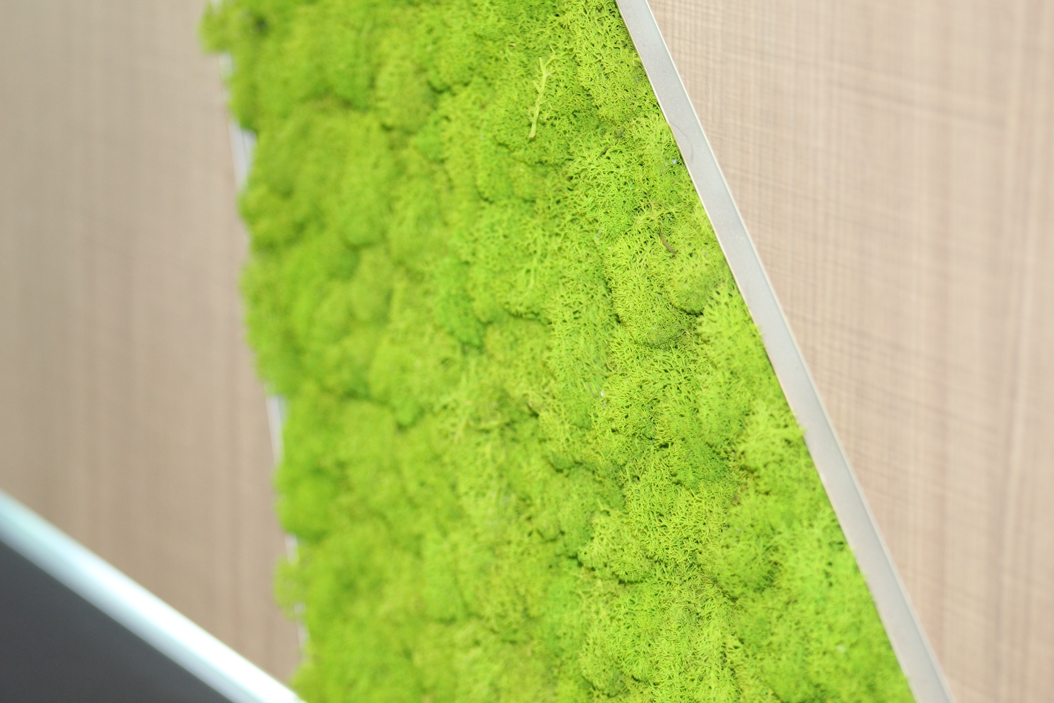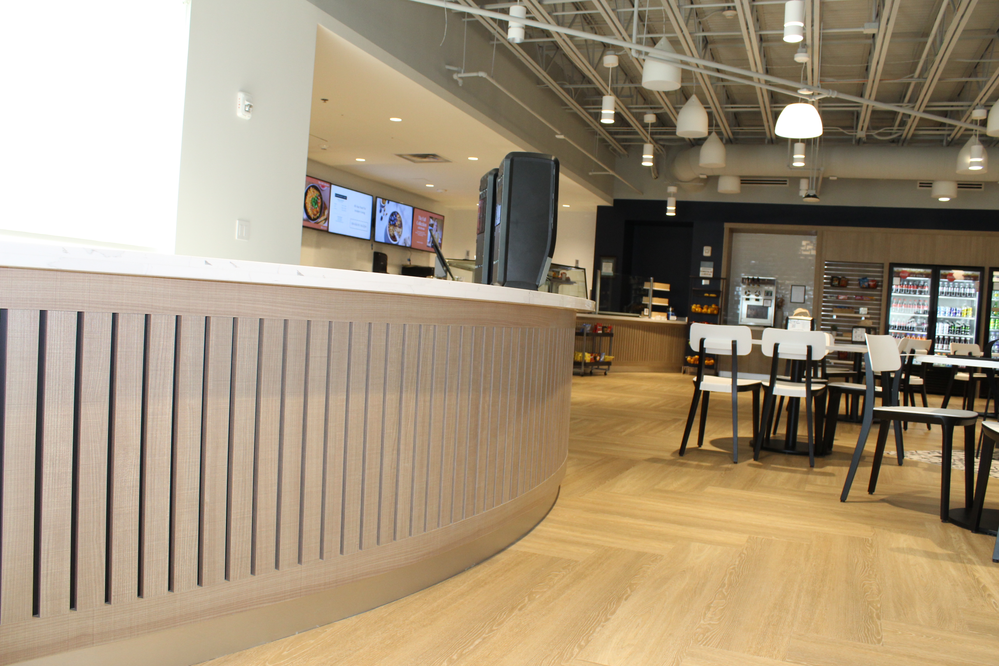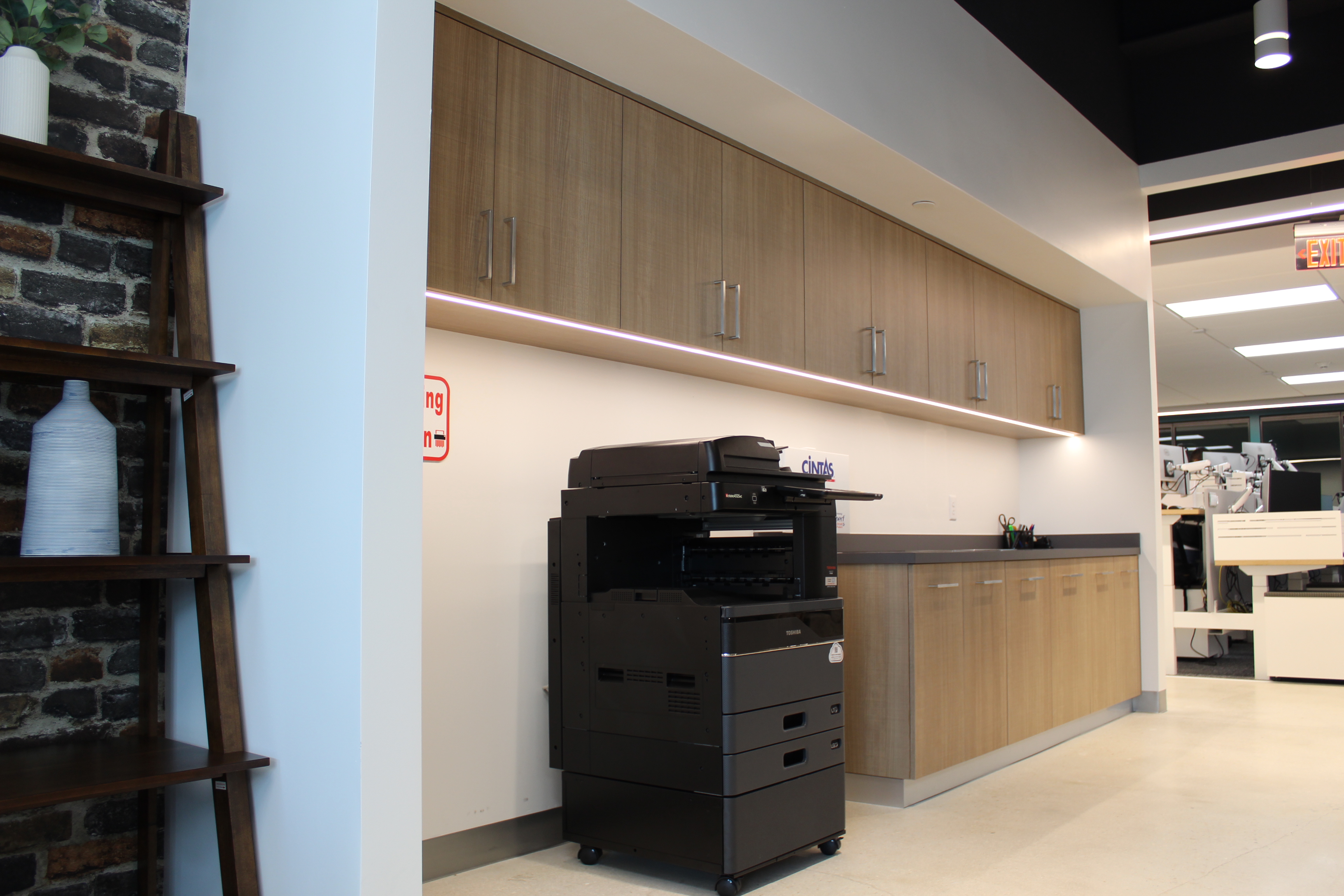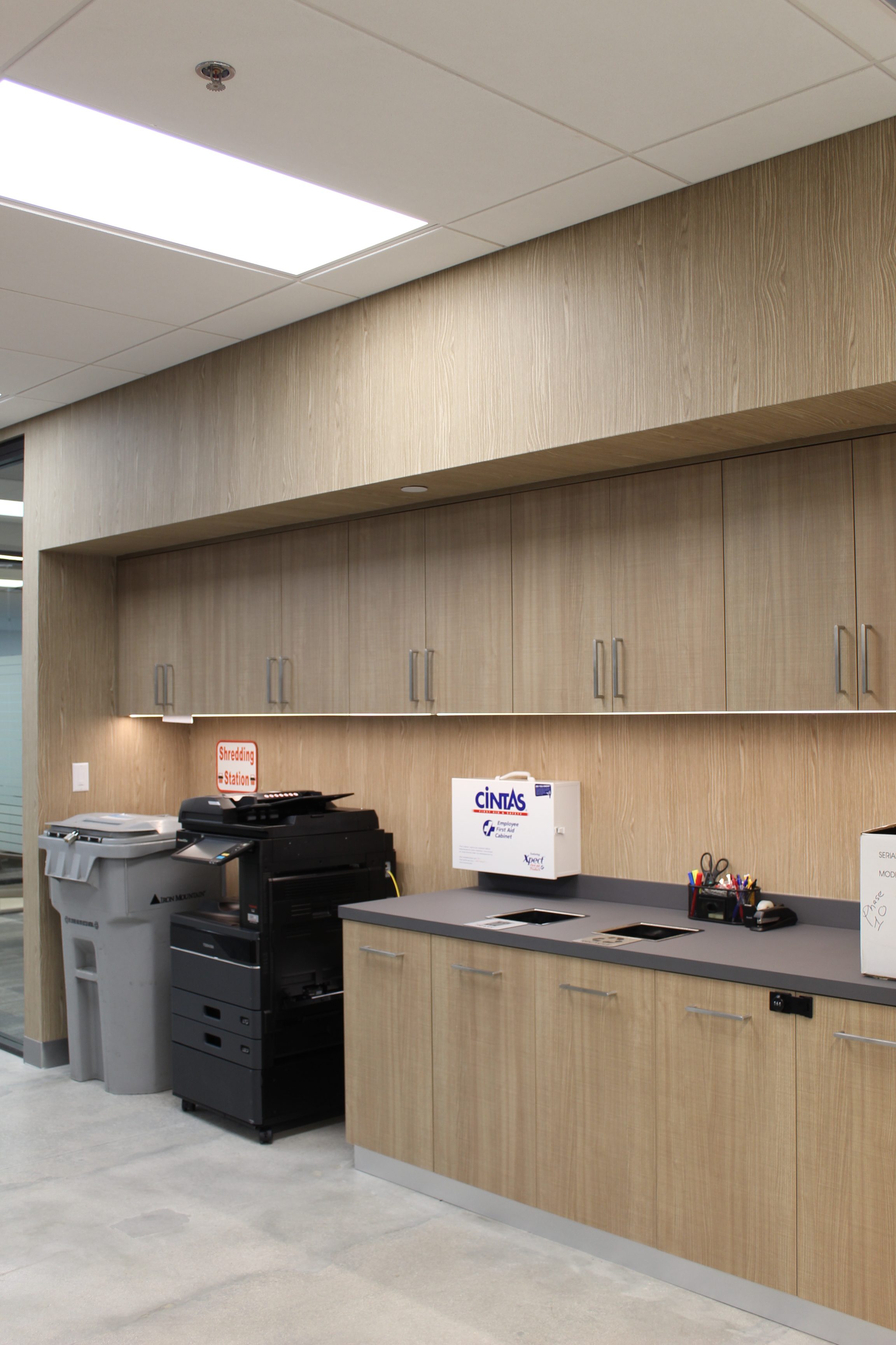 Green accents and custom woodwork bring corporate